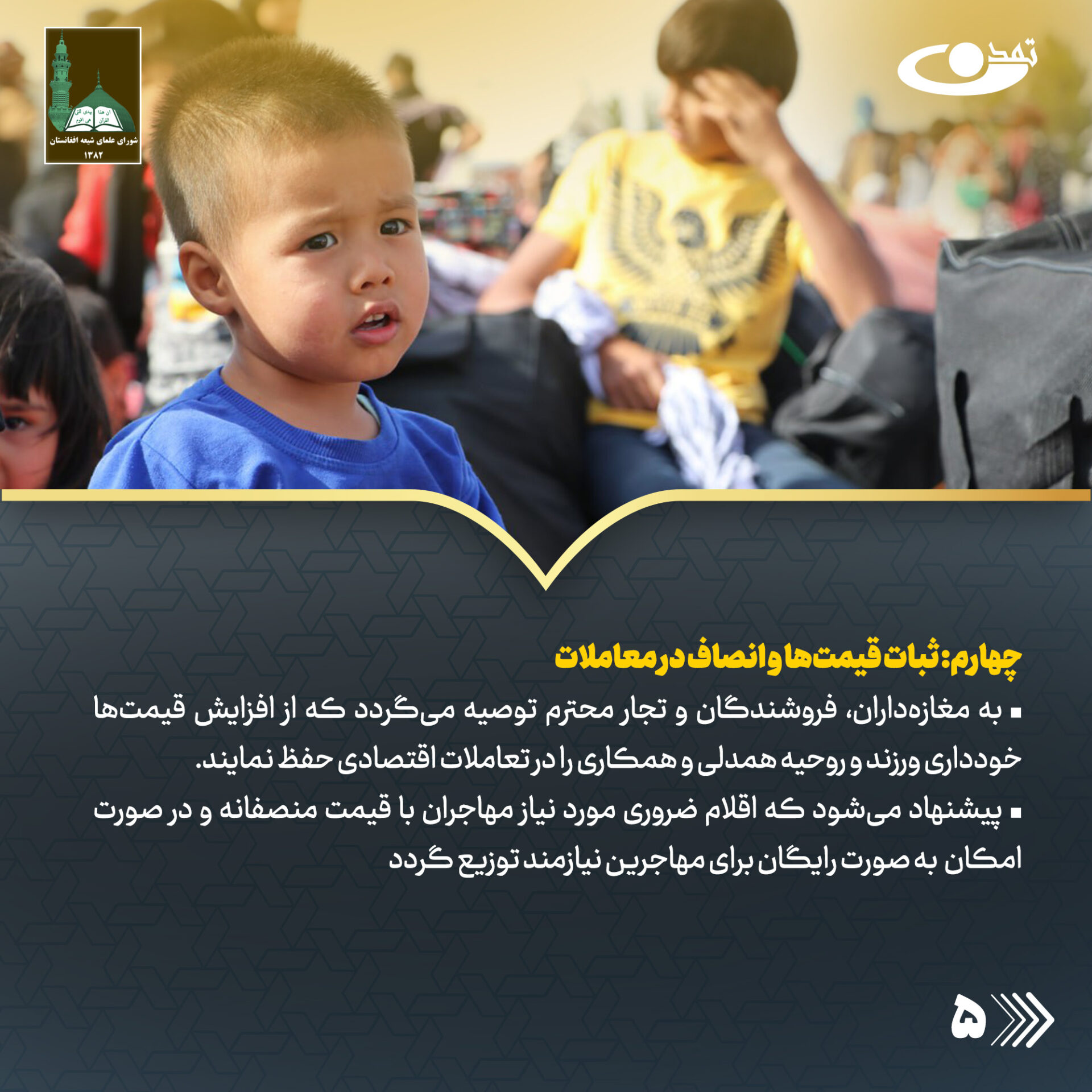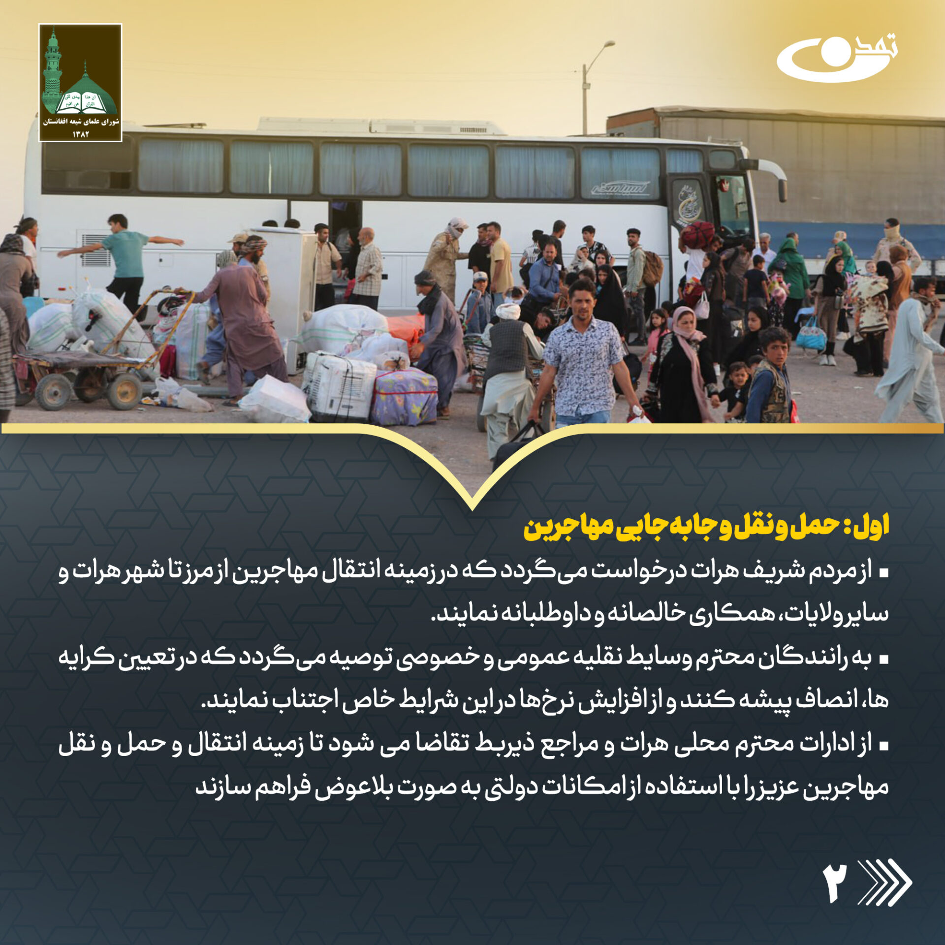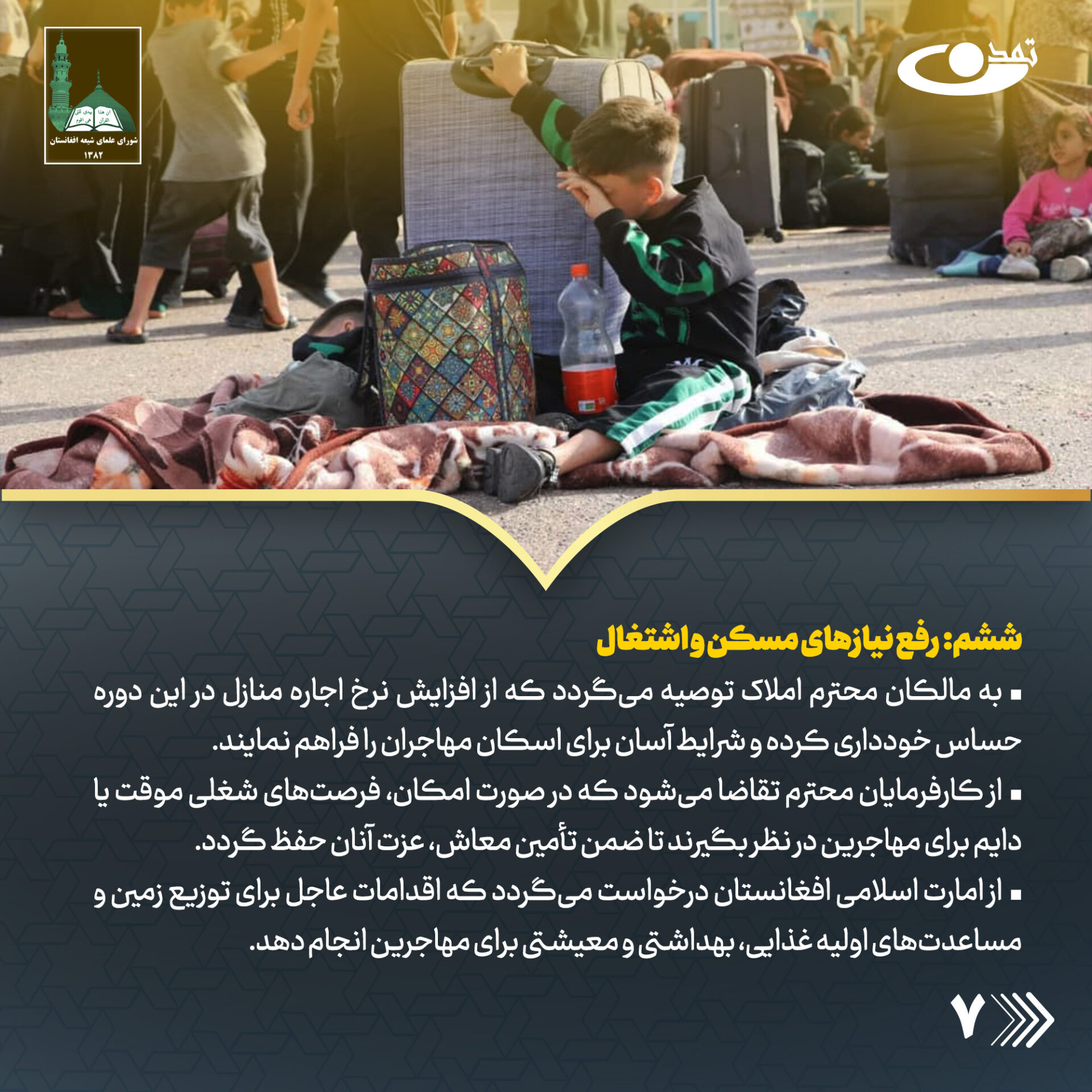 با توجه به بازگشت گسترده هموطنان مظلوم و شریف ما از جمهوری اسلامی در روزهای اخیر و با درنظرگرفتن مسئولیت دینی، انسانی و ملی، شورای علمای شیعه افغانستان بدین وسیله نکات مهم ذیل را جهت همکاری سراسری به عموم ملت عزیز، مراجع رسمی، نهادهای دینی، اجتماعی و خیریه توصیه مینماید: