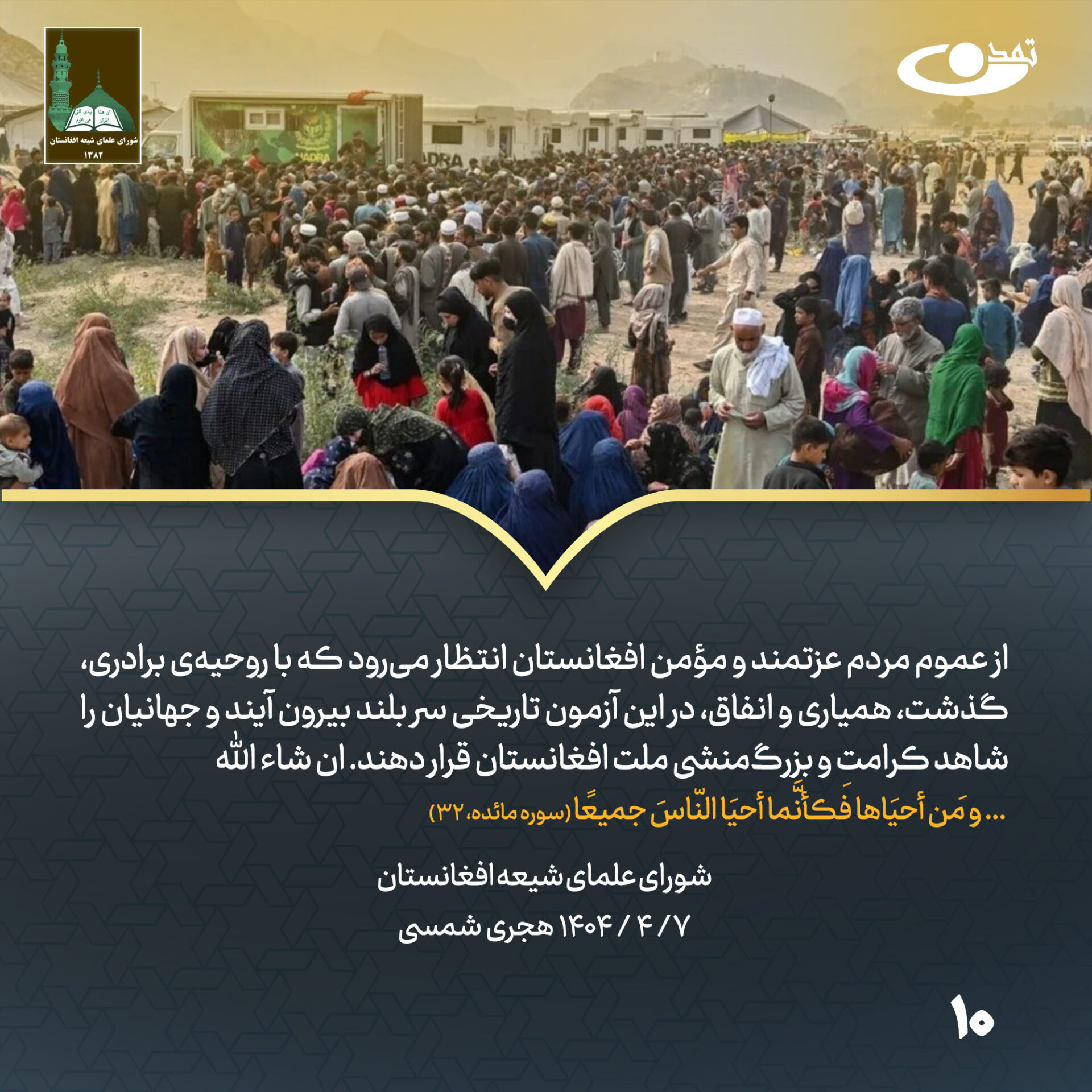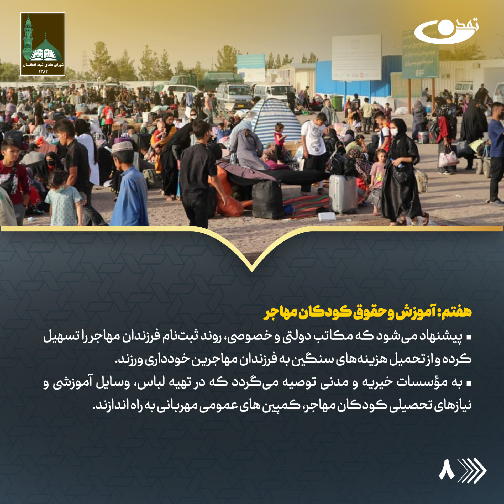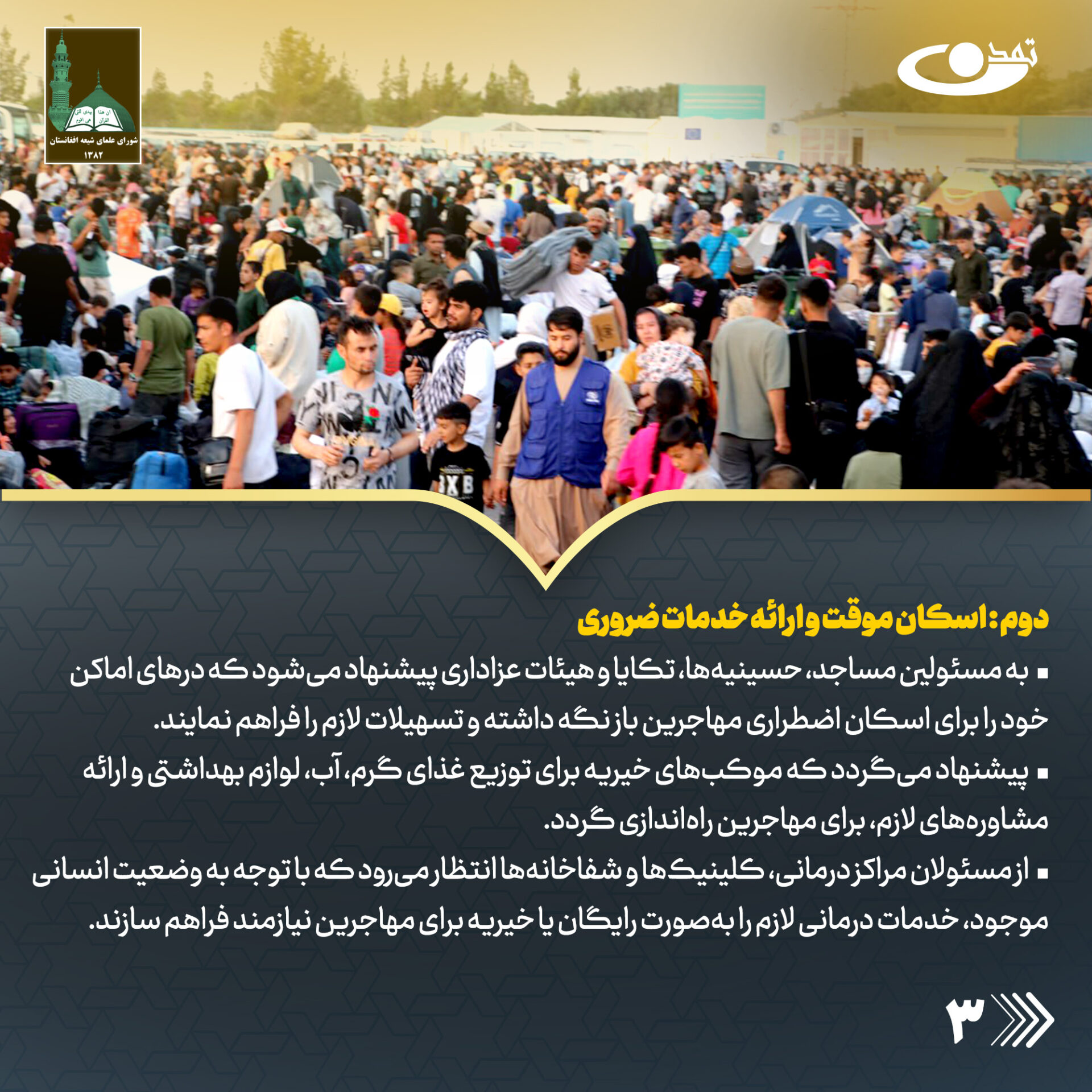 با توجه به بازگشت گسترده هموطنان مظلوم و شریف ما از جمهوری اسلامی در روزهای اخیر و با درنظرگرفتن مسئولیت دینی، انسانی و ملی، شورای علمای شیعه افغانستان بدین وسیله نکات مهم ذیل را جهت همکاری سراسری به عموم ملت عزیز، مراجع رسمی، نهادهای دینی، اجتماعی و خیریه توصیه مینماید: