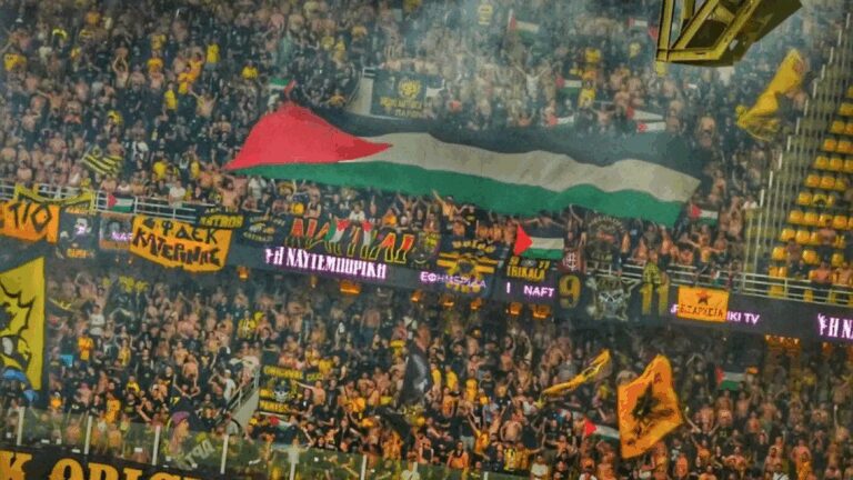 هواداران فوتبال فوتبال آ.اک یونان در بازی با تیم هاپوئل اسرائیل به حمایت از مردم فلسطین پرداختند. خبرنگار ورزشی فارس، شبکه الجزیره امروز(شنبه) خبر داد